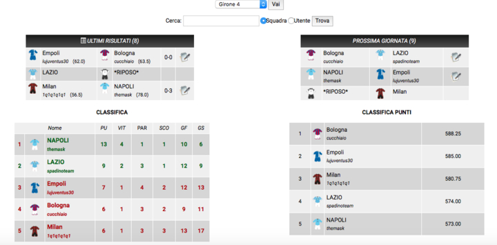 GIRONE 4: Qualificata di diritto il NAPOLI di themask con i suoi 13 punti e rimane in corsa ma solo parzialmente L' empoli di lujuventus30 che dovrà disputare una sola gara e dovrà fare bottino pieno contro appunto la capolista e dovrà sperare che la LAZIO di spadinoteam perda entrambe le sfide contro il BOLOGNA di cucchiaio fermo a 6 punti con ancora qualche speranza di qualificazione e contro il MILAN di 1q1q1q1q1 fermo a 6 punti ma già eliminata dalla competizione!