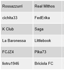 Spicca lo scontro tra K CLUB-SAGA che allontanerà o una o entrambe dalle prime 3 posizioni e il testa/coda LIOTRU1946-BRICIOLA FC