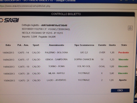 Scommessa Milan 1 Torino gol Samp 1x Roma 1 Parma 1x Palermo 1 Chievo 2