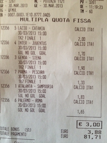 LAZIO-CATANIA 1 - INTER-JUVENTUS GOL - GENOA-SIENA 1 - PARMA-PESCARA 1 - PALERMO-ROMA GOL - ATALANTA-SAMPDORIA GOL. Buona Pasqua a TUTTI!