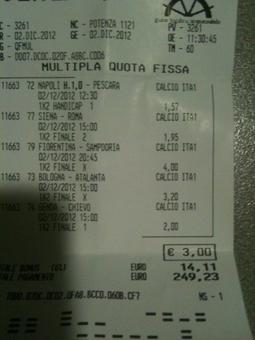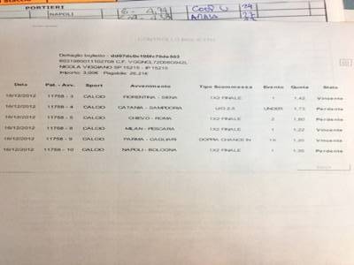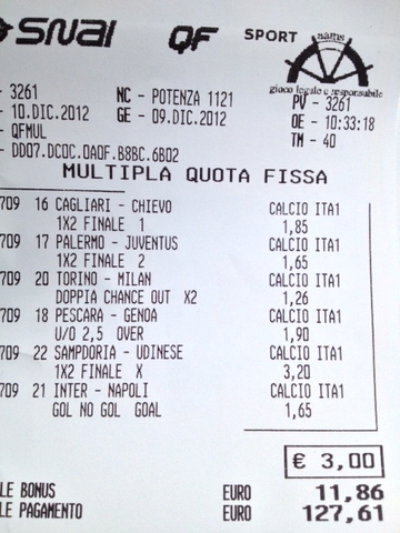 Scommessa "IPIASTRONI": CAG-CHI 1, PAL-JUVE 2, TOR-MIL X2, PES-GEN Over, SAMP-UDI X, INT-NAP Goal. CIA'