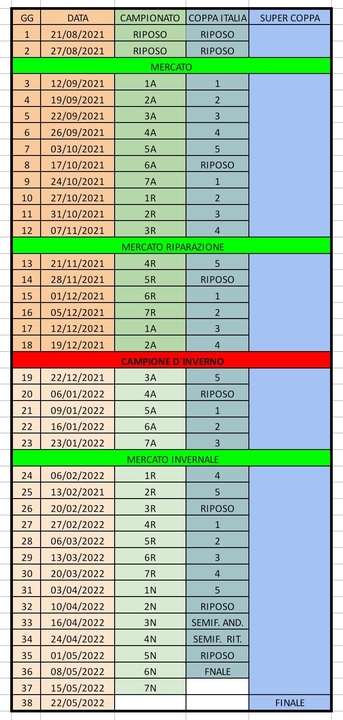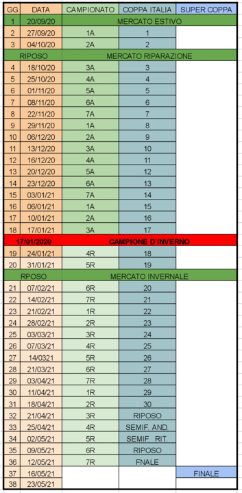 Ci sarà prima del mercato invernale di febbraio un altra sezione di mercato. Alla fine della 18 giornata si avrà il campione d'inverno. Dopo di che ci sarà ultima giornata di mercato in coincidenza della chiusura del mercato invernale, nel grafico vengono riportate sia le giornate di mercato e sia le giornate di coppa italia...