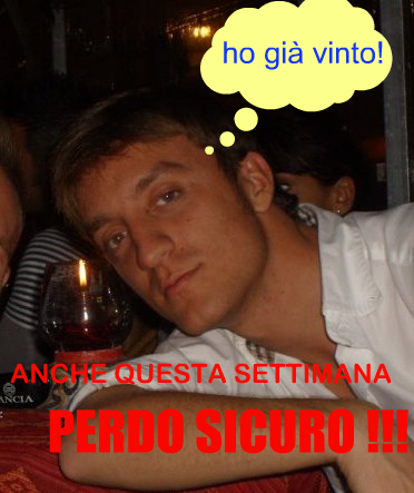 io propongo di eliminare direttamente l'ultimo posto e riscuotere i 100 ? di joel....tanto le partite contro di lui...sono inutili...è come vincere a tavolino! NO NO NO IO PERDO SICURO FACCIO + SCHIFO DI TE XKè CONTRO DI TE HO PERSO...PERDO E PERDERO' CHE DISDETTA! :'(