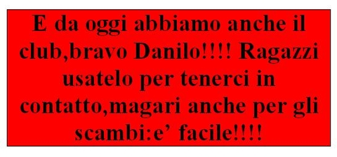 Ottimo lavoro Danilo,con la creazione del club si fa' un gran passo avanti!Ben visibile nella home di lega in teoria dovrebbe raggiungere tutti gli utenti,anche i meno avvezzi con i forum visto che fin ora nel forum siamo entrati solo in tre persone.Con il club potremmo publicare foto divertenti,magari anche Danilo con la coppa,video,magari solo semplici comunicazioni tra noi pubblicando un articolo.MAGARI RAGAZZI USATELO ANCHE SE VOLETE FARE SCAMBI O OFFRIRE GIOCATORI A NOI ALTRI,HAI VISTO MAI!