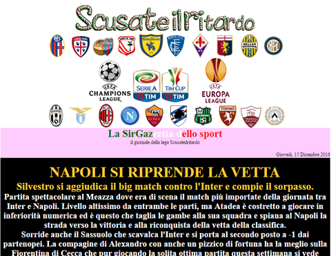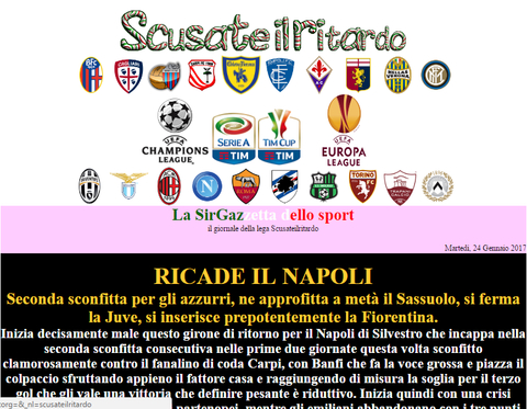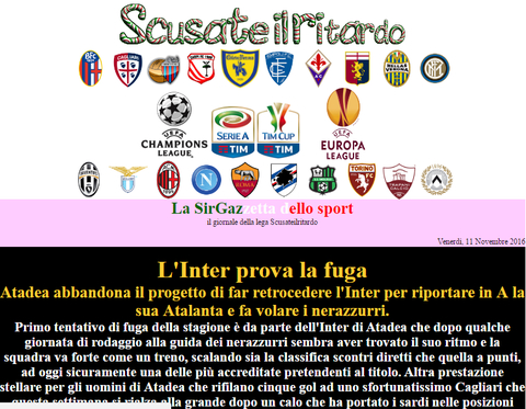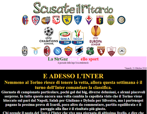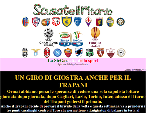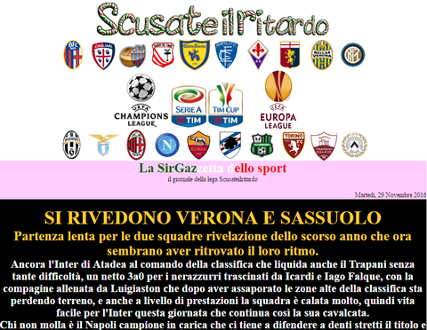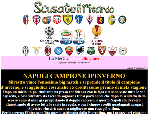 Aggiornamento effettuato. Commentata la chiusura del girone d'andata delle varie squadre e i quarti di finale di coppa italia, e sono stati assegnati i premi di metà stagione. Le squadre Empoli, Cagliari, Trapani e Genoa hanno diritto anche al premio speciale previsto per la loro categoria, il premio va richiesto lasciando messaggio nell'apposito post creato nel forum di lega.