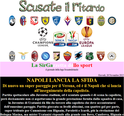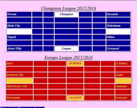 Aggiornamento effettuato. Vi ricordo che questa giornata si sono disputate anche le prime gare di Champions League che hanno riservato non poche sorprese, con la Premier League che domina sulle italiane, con lo Stoke City che si impone di prepotenza contro la capolista Verona e mette mezzo piede in semifinale, cinque gol segnati fuori casa sono un macigno sulle spalle del Verona di Cammisone che ha tutte le carte in regola per ribaltare il risultato, ma non sarà per niente facile. Stessa sorte è capitata alla seconda classificata del campionato italiano, che deve arrendersi contro la rivelazio...