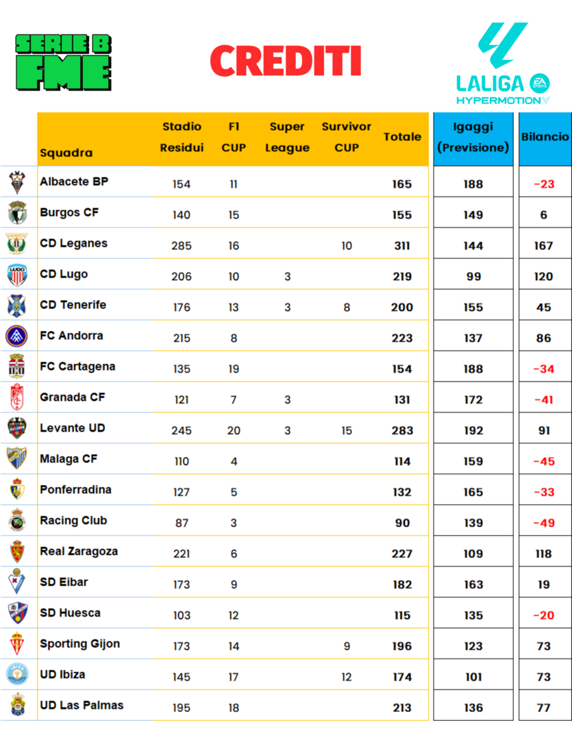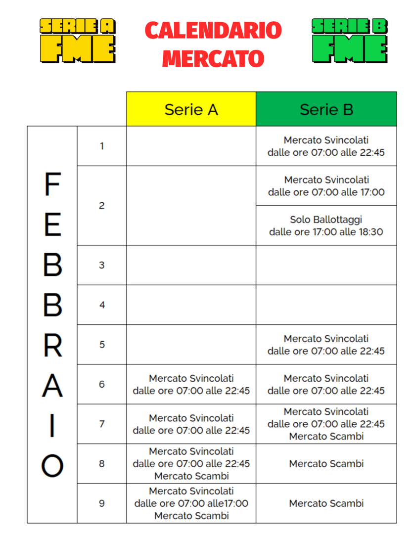 Buongiorno a tutti, iniziamo con il calendario del Mercato Svincolati (asta buste chiuse) diviso in queste giornate tra Serie A e Serie B. Premessa importante vi allego in seguito la situazione dei crediti aggiornata alla 17° per la serie B ed alla 20° per la serie A che saranno inseriti in Fantaclub. Ho inserito anche la "previsione" degli ingaggi dei contratti dei giocatori con contratto in modo da avere già un ipotesi di bilancio. Il vostro budget potrà aumentare con gli incassi stadio o premi. Ricordatevi sempre quindi di essere "equilibrati" nelle uscite altrimenti vi troverete in diffico...