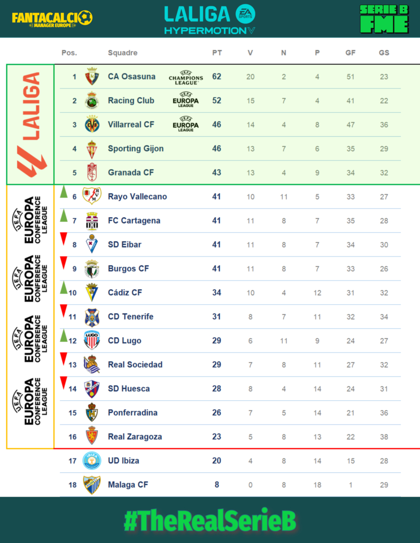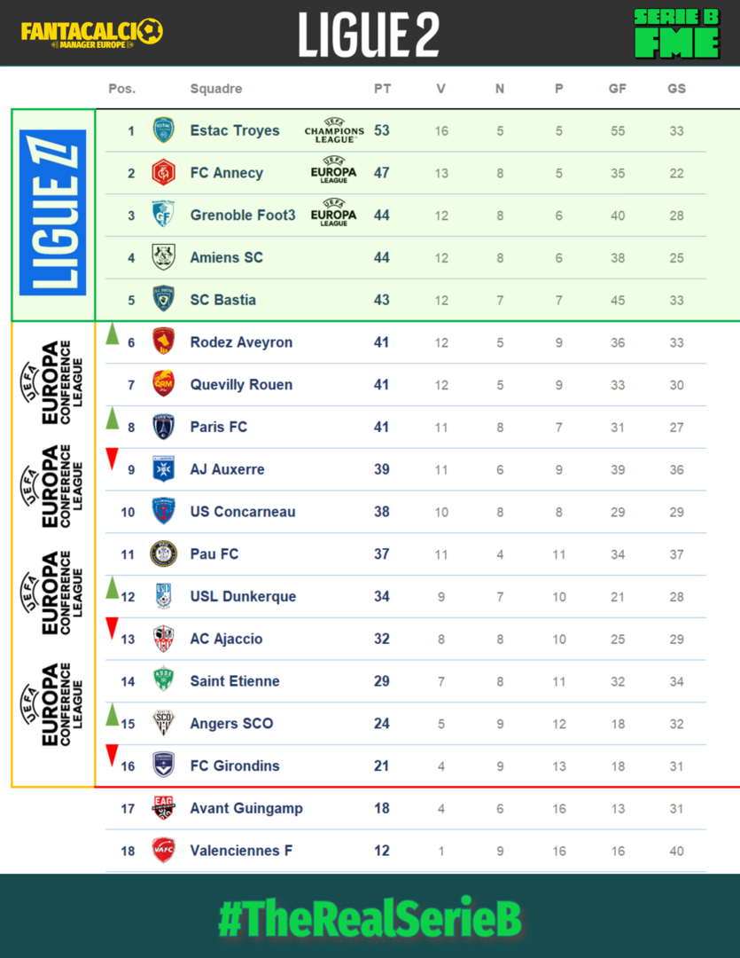 Resta al comando Estac Troyes, club con il punteggio globale più alto di tutte le 4 leghe! Complice però qualche battuta d'arresto nell'ultimo periodo il FC Annecy non molla la volata verso la vetta. Dietro almeno 10 club che lotteranno per un posto in LIGUE1 occhio all'Auxerre che sin qui non ha avuto un calendario favorevole. Lega molto equilibrata si deciderà molto nell'ultima giornata.