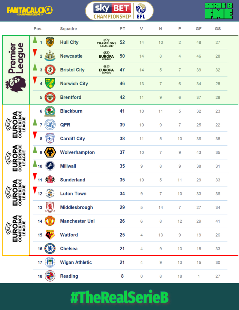 A 8 giornate dalla fine, con 24 punti a disposizione in Championship l'Hull City passa al comando sfruttando il momento negativo del Newcastle legato al più classico dei "pacchi" del mercato di febbraio, si parliamo di lui, Gianluca Lapadula. Seguono Bristol, Norwich e Brentford che deve difendere la voglia di tornare in Premier da un nutrito gruppo di club che gli sono alle costole. Insomma con 24 punti a disposizione nessuno dorme sonni tranquilli.