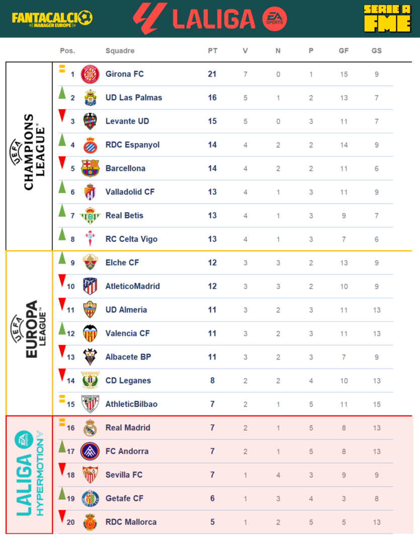 Prende le distanze il Girona. Battuta d'arresto per il Levante e Barcellona. Soliti frequentatori dei bassifondi il Real Betis e il Valladolid ora hanno le vertigini. Espanyol sale prepotentemente la classifica. La rivelazione al momento sicuramente Las Palmas. Inaspettatamente ad un passo dal baratro il Bilbao, altra sconfitta e peggior difesa della LaLiga, la fortuna non sta girando.