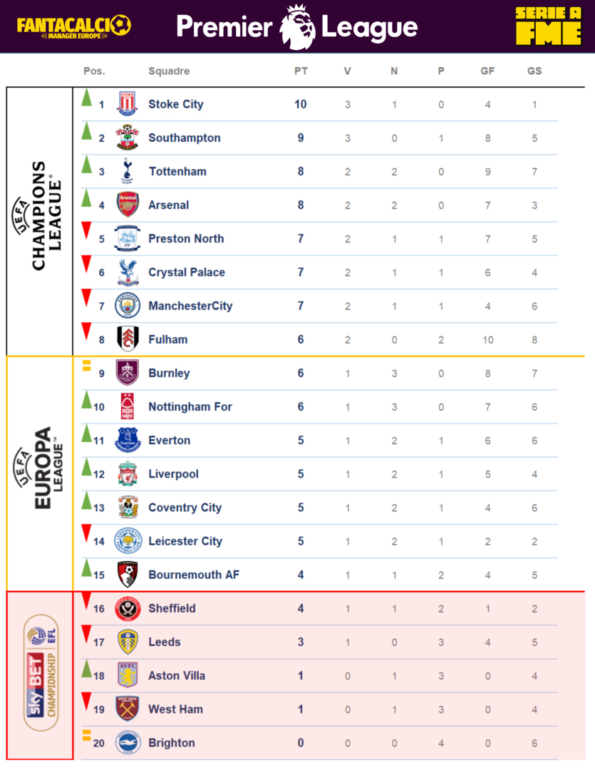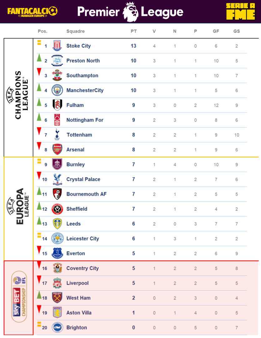 Stoke al comando seguita da un altra neopromossa il Preston insieme a due vecchi volponi Southampton e City campione in carica. In fase di studio l'algoritmo che ha generato 10 punti al City con 5 gol fatti e 6 subiti, una parola Magia! Premio sfortuna al Burnley. Il Coventry nella zona calda della classifica inaspettatamente, mentre sul Brighton, che non molla (Lautaro), non vi sono dubbi, i bookmakers bancano la quota.