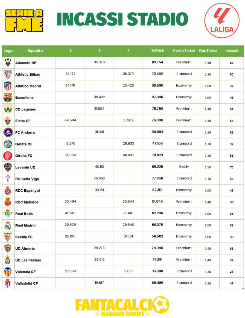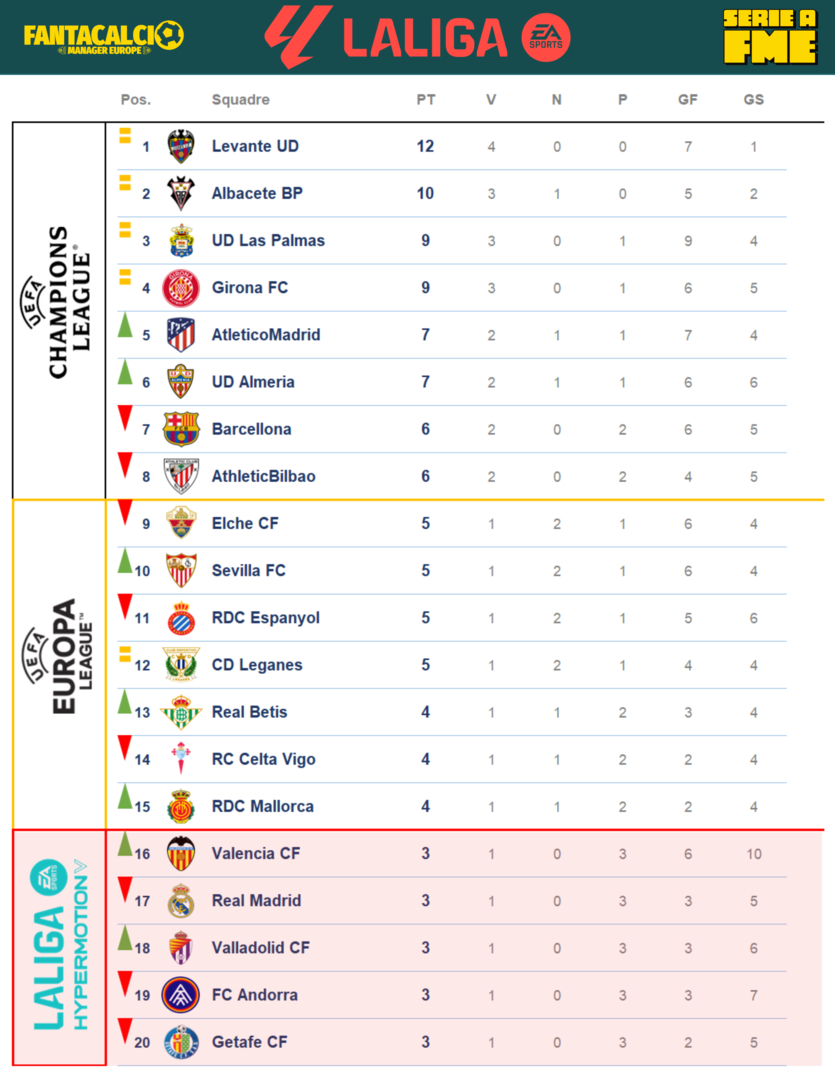 Altra neopromossa al comando, il Levante, seguita dal Girona che come l'anno scorso si conferma squadra imprevedibile, si passa da 65 a 92 in un attimo. Bene le altre due neopromosse e l'Almeria. Maluccio le protagoniste dell'anno scorso Bilbao e Barcellona. Si prevede grande bagarre per non retrocedere e tutti si chiedono ma il Betis perché non è qui con noi?