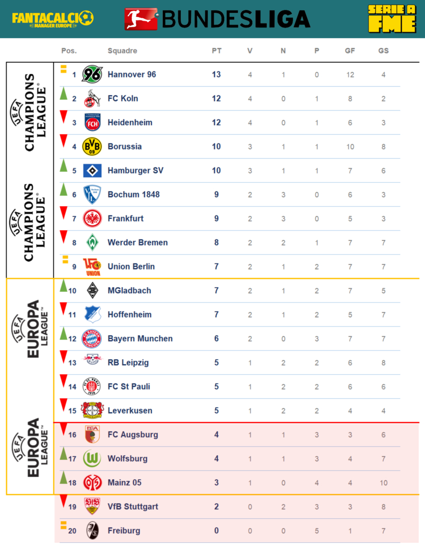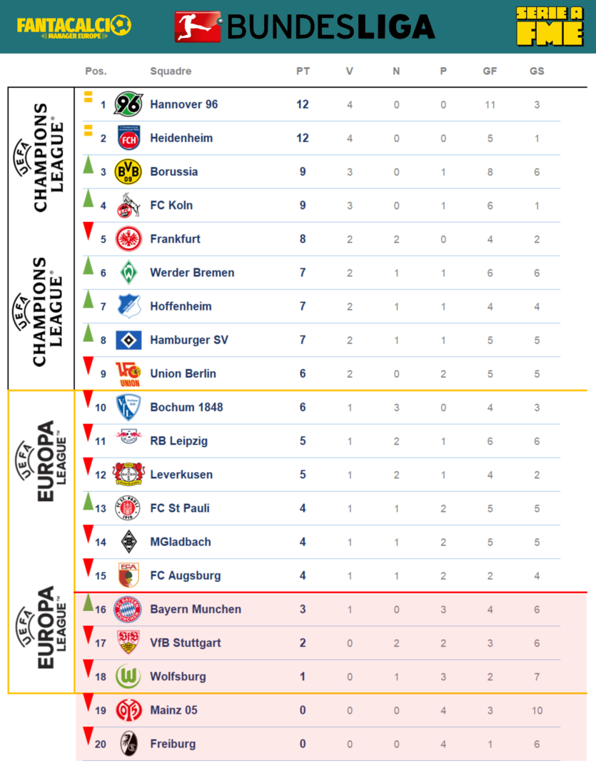 Bomber Djuric regala all'Hannover un punto importante per mantenere la vetta della classifica. Classifica molto corta, ancora prematuro capire quali club saranno protagonisti. Premio sfortuna al Mainz, 10 gol subiti sono troppi, ma nell'ultima partita arrivano i primi 3 punti che muovono la classifica.
