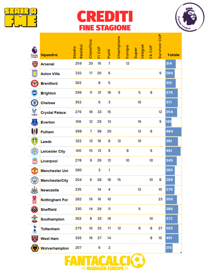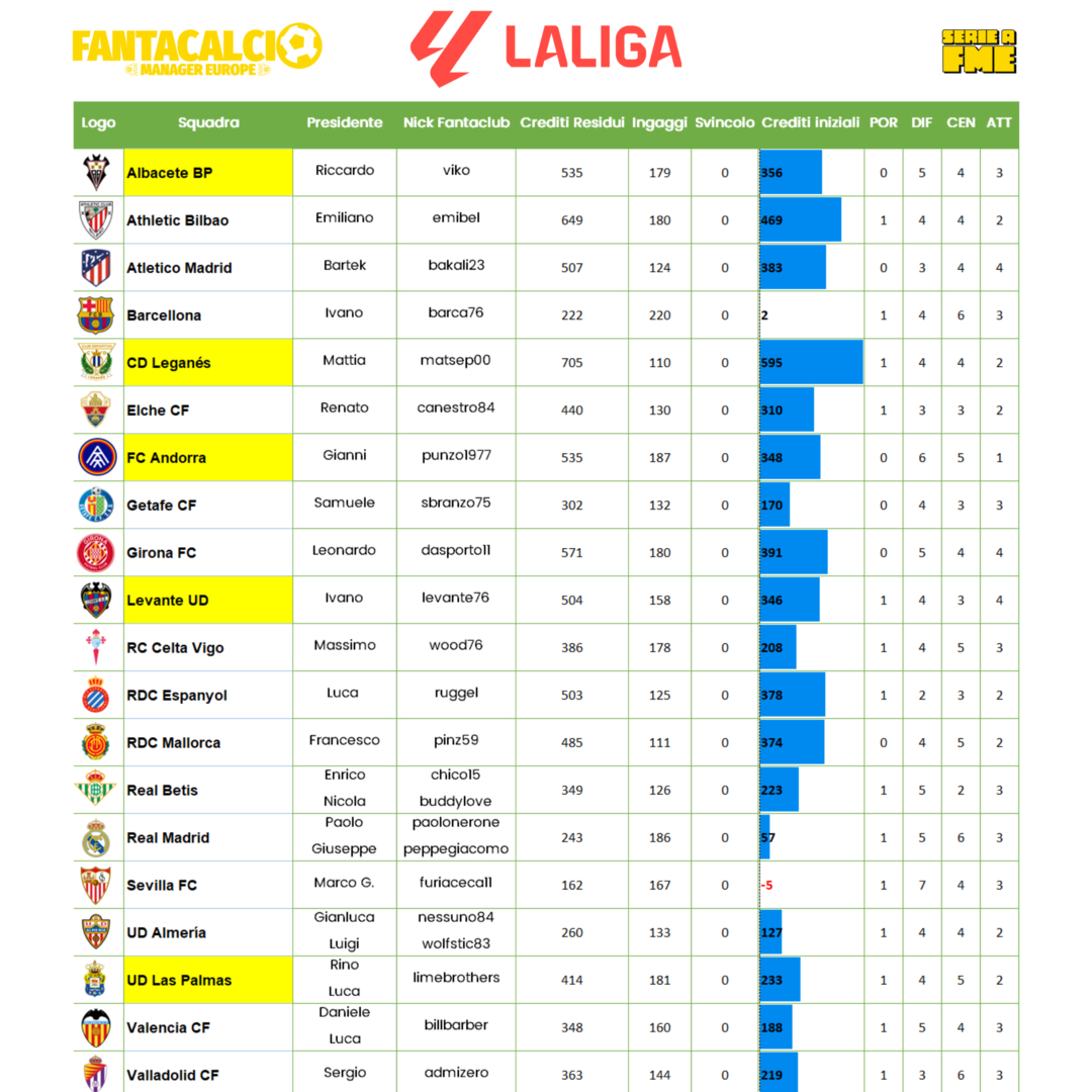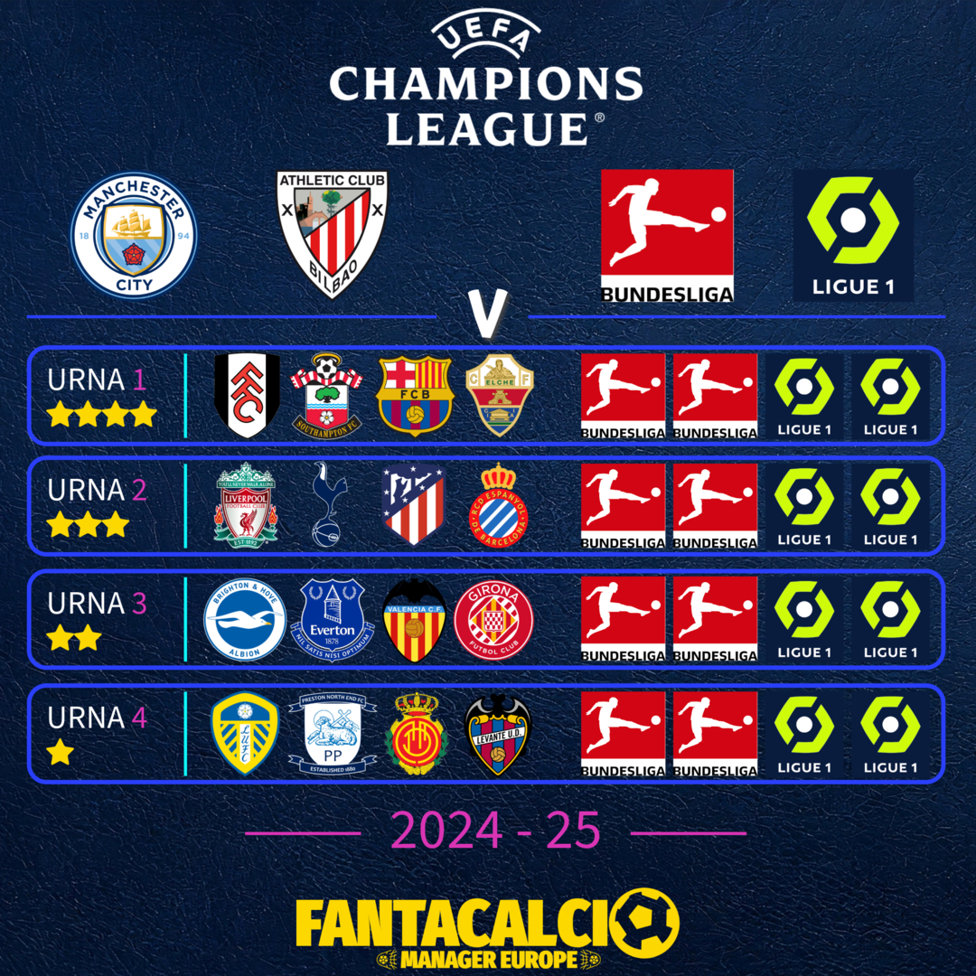 In attesa delle squadre di Germania e Francia, che si giocheranno l'accesso in Champions dalla 1° alla 19° giornata, ecco il ranking FME delle qualificate (Spagna ed Inghilterra) in Champions della prossima nuova edizione.
