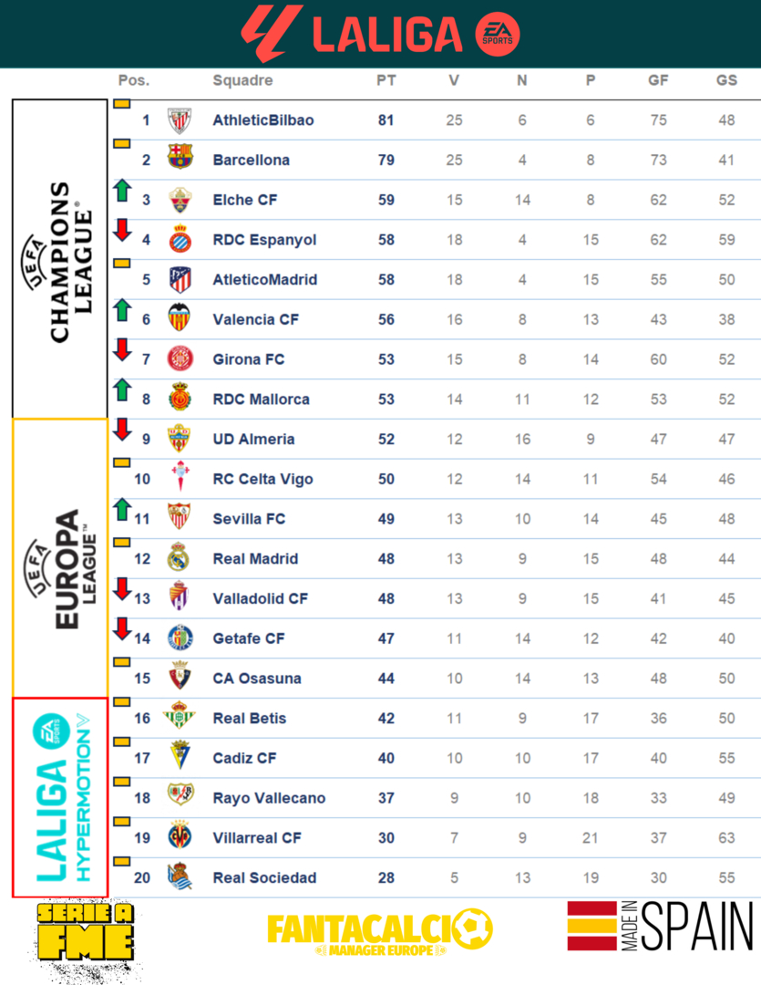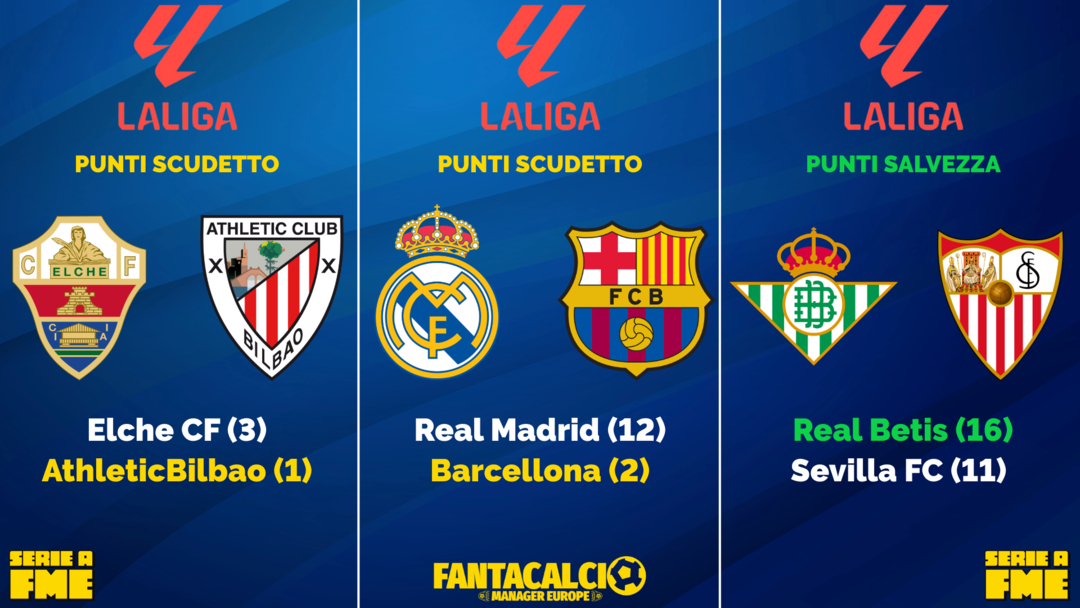 Nella Liga sempre corsa a due il Bilbao in casa dell'Elche che non vuole perdere il podio ed il Barcellona in casa del Real nel El Clásico. Ultima chance per il Betis che deve vincere per restare aggrappato ad una labile speranza di salvezza.