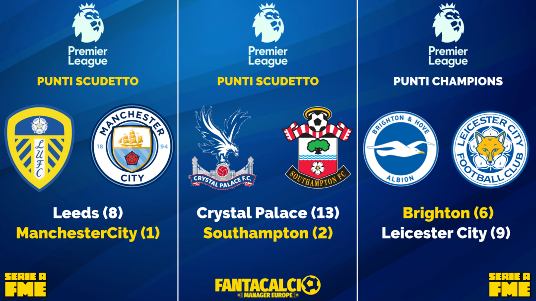 Lotta a due per il titolo: Manchester in casa del Leeds che vuole mantenere la posizione in Champions, il Southampton in casa dell'imprevedibile Palace. Punti Champions in palio tra Brighton e Leicester.