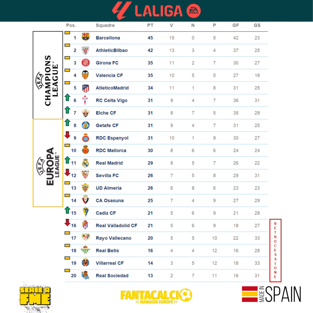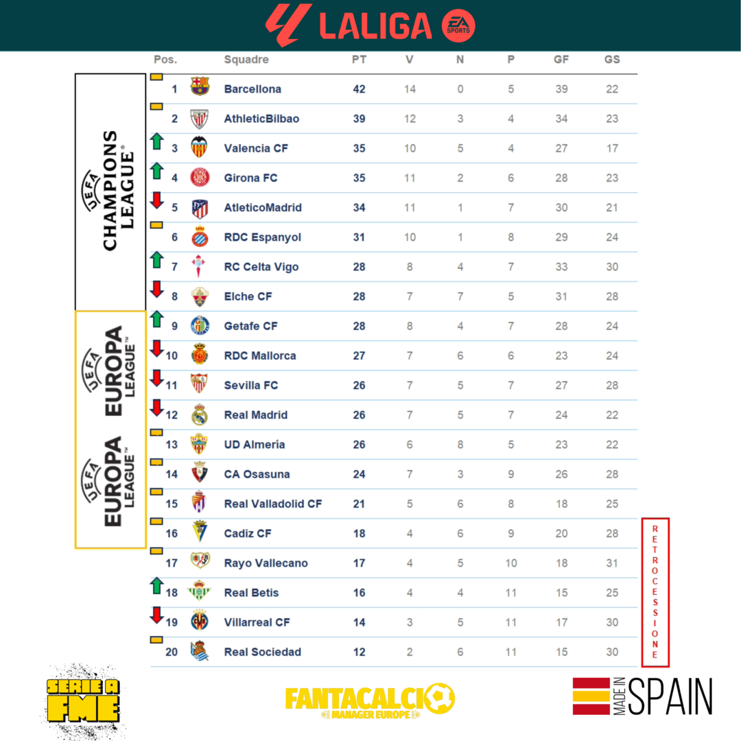 Classifica LaLiga aggiornata. Anche in LaLiga complimenti al RC Celta Vigo che conquista un posto in Champions League nell'ultima giornata.