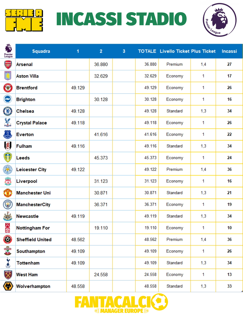Incassi da stadio della prima giornata delle Premier