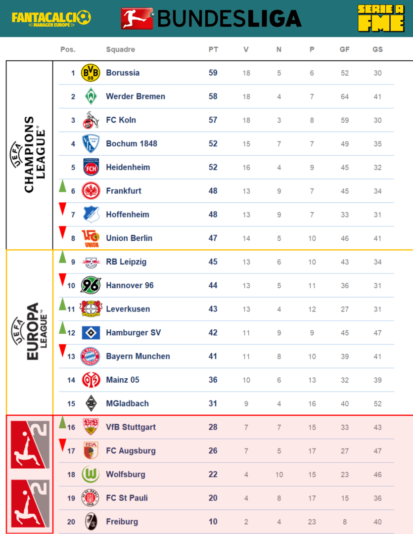 il miracolo Borussia! Se ti limiti a guardare la rosa non riuscirai mai capire come faccia a stare lì il Borussia, poi leggi il nome del presidente e tutto ti è più chiaro….segue il Werder Bremen che sulla carta sembra il club da battere. Poco dietro il Koln altro club molto attrezzato. Sarà una corsa a due, anzi a tre (scusate avevamo dimenticato il Borussia)? No, attenzione al Bochum e all’Heidenheim che hanno investito tanto nel mercato di Febbraio e sono li come le altre che seguono, basta un filotto di vittorie. In zona retrocessione soprattutto MGladbach e Mainz 05 devono difendere la po...