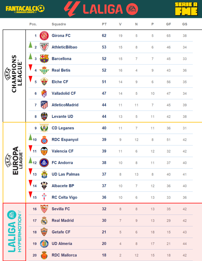 Neanche la dipartita di Kvara ha avuto effetto sul Girona sembra stia facendo un campionato a parte. La vittoria finale è quotata dai bookmakers ad 1,20. Segue il Bilbao, campione in carica, che dopo un inizio campionato molto difficile ha scalato la classifica tornando in cima. Clima comunque di contestazione tra i supporter che contestano i mancati investimenti sul mercato di febbraio, i molti definiscono il presidente Emiliano l’Aurelio De Laurentis della LaLiga. A seguire tra il solito Barcellona e l’Elche il sorprendente Real Betis, salvatosi all’ultima giornata l’anno scorso, quest’anno ...