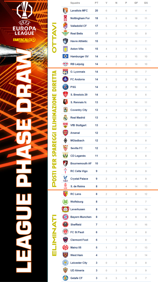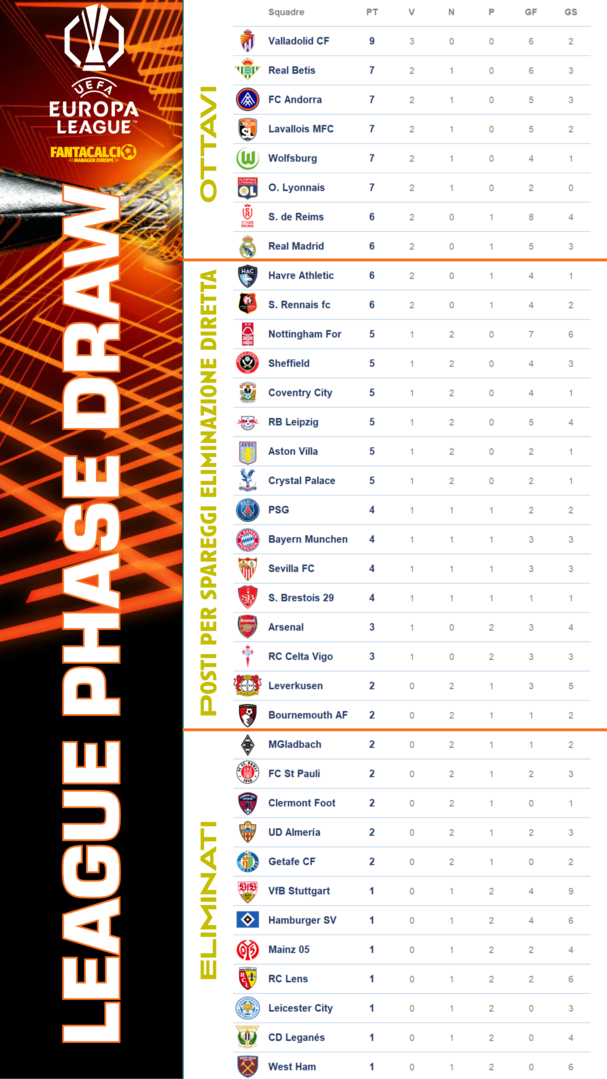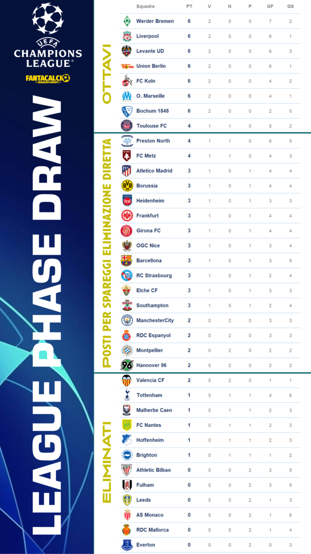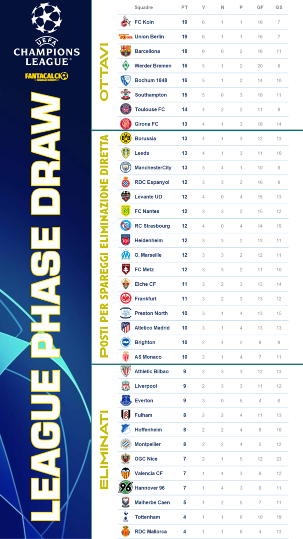 Classifica alla 5° Giornata. Vola il Koln di Enrico a punteggio pieno. In affanno due club prestigiosi come il Tottenham e Fulham.