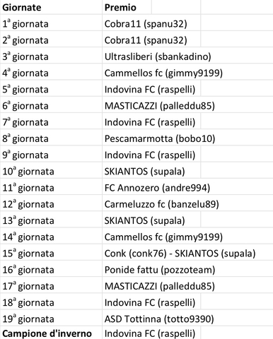 Con la giornata appena trascorsa si chiude un interessante girone d'andata contrassegnato dalla supremazia della matricola Indovina FC (raspelli) dell'accoppiata Scodinu-Cherchi, che dunque si portano a casa il premio di "Campione d'inverno"! Quando si dice la fortuna del principiante... 😉