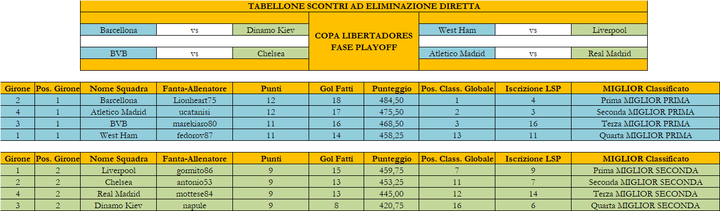 Siamo quasi agli sgoccioli della seconda fase (Clausura) della lega LSP. In questo turno si disputerà la finale di Copa Libertadores tra il Borussia Dortmund di marekiaro80 e l'Atletico Madrid di ucatanisi mentre con il prossimo terminerà il Torneo di Clausura dove il Barcellona di Lionheart75 è saldamente in testa.