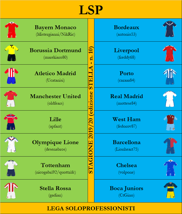 Terminata la prima fase della Lega SoloProfessionisti ossia il Torneo di Apertura vinto da ucatanisi alla guida dell'Atletico Madrid e della Copa SudAmericana che ha visto trionfare il Borussia Dortmund di marekiaro80 ... adesso si riparte !!!