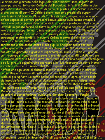 ragazzi ho finalmente aggiornato il forum con le immagini della terza stagione della lega SoloProfessionisti...chiedo scusa per il ritardo, ma con il lavoro e lo studio il tempo è ridotto al minimo, spero vi piaccia anche se mano mano, andando avanti con la stagione sarà migliorato nell'aspetto e nei contenuti...ovviamente anche la home sarà sempre aggiornata...per intanto vi invito a partecipare e contribuire alla vita della lega....VI ripeto che se volete mettere qualche pulce nell'orecchio dei "giornalisti" della lega potete inviare un messaggio privato a me, a CtGino o a Ronaldinho...tutto...
