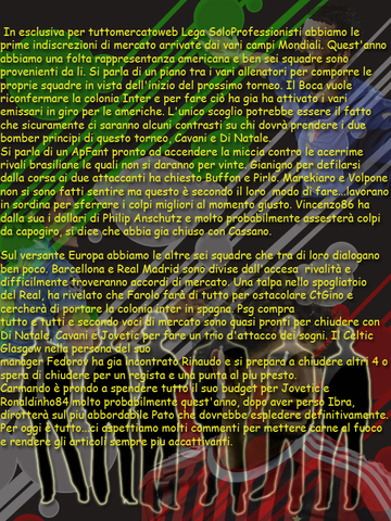 Pubblicata nella HOME qualche piccola notizia di calciomercato giusto per stuzzicarvi...Commentate qui sotto e mandatemi qualche notizia..indiscrezione che riuscite ad intuire...sarà tutto pubblicato :)
