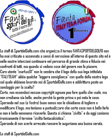 Caro utente "markus81" non le sembra che il logo della sua lega intitolata "ITALYTEAM" abbia qualche "leggera somiglianza" con quello della nostra lega sul quale abbiamo lavorato noi di SportdelGolfo.com e addirittura posto un sondaggio per la scelta?