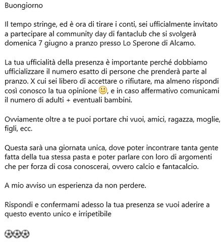 Che poi chi vuole giocare seriamente non gioca per quei 40 euro che non sono quelli che ci fanno consegnare la formazione fino alla fine per non falsare almeno i gironi. Ok Europa League e Champions,ok 2 gironi,ma poi al massimo ci dovrebbero essere altre 2 competizioni e sono pure troppe senno' non ci si capisce un kaiser e vincere poco nemmeno ti premia.Una magari riservata per le ultime giornate solo alle formazioni peggiori della lega per invogliarle a consegnare magari con la speranza di vincere un centone,ma solo per loro.Perche' se le peggiori le metti comunque in competizione con le migliori quali chance avrebbero?Tutto qui. E mi fermo qui,a te la palla.Io partecipo comunque.