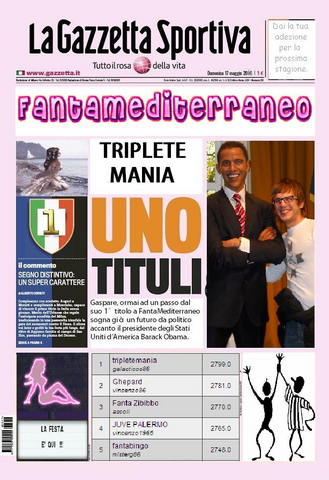 Gaspare, giovane promessa dell' 86' stà lasciando tutti senza parole, al suo primo anno con la squadra Tripletemania è ormai ad un passo dalla conquista del titolo che lo laureerà campione della lega Fantamediterraneo.