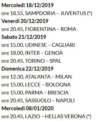 SI INIZIA MERCOLEDI 18 DICEMBRE CON SAMPDORA-JUVENTUS, SI PROSEGUE VENERDI-SABATO-DOMENICA 20-21-22 DICEMBRE E SI CONCLUDE L'8 GENNAIO 2020 CON LAZIO-VERONA.