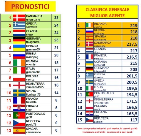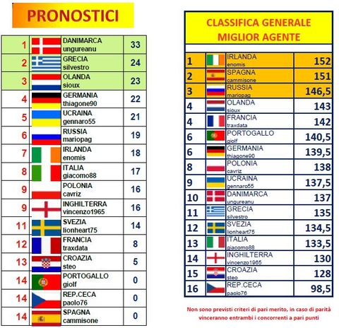 L'ultima giornata non porta radicali cambiamenti nella classifica a pronostici. Infatti nell'alta classifica solo OLANDA e GERMANIA fanno un punto, e gli olandesi di sioux agganciano la GRECIA di silvestro al secondo posto a 24 punti mentre i tedeschi di thiagone chiudono al terzo posto a 23....prima incontrastabile la DANIMARCA di mister ungureanu a 33 punti
