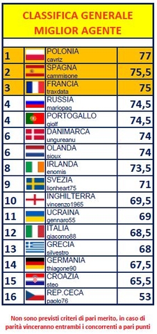 Nella classifica agenti grande battaglia nell'ultima giornata con molte squadre che sono andata vicine alla vittoria finale. Basti pensare che tra la 1^ e la 7^ squadra ci sono solo 4 punti...a spuntarla è l'IRLANDA di enomis che bissa ...