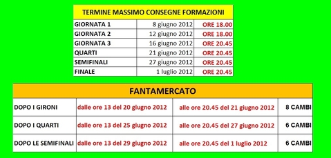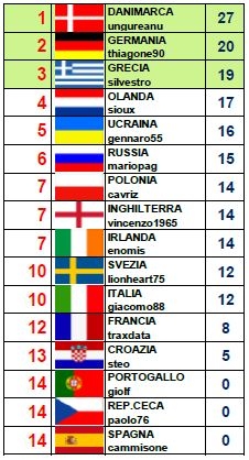 Per dare possibilità a tutti di giocare al fantaeuropeo fino alla finale ho pensato di inserire anche una CLASSIFICA A PUNTI a cui parteciperanno tutti fino alla finale..quindi anche chi eliminato può divertirsi con il mercato per concorrere a quest'altra classifica che ne premierà sempre 3.