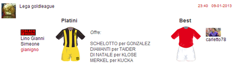 Appena ufficializzato lo scambio tra Owen e Nedved delle due punte militanti in squadre emiliane: Amauri per Gilardino piu un conguaglio di 5 crediti a favore del team di Giolf (inserita una clausola di annullamento in caso di infortunio grave in questa settimana, quantificabile dalle 3 settimane di stop in su). Soddisfazione reciproca per la conclusione dell'accordo avvenuto in pochissimo tempo, si spera che le due punte possano trovare nuova linfa nei rispettivi nuovi club di appartenenza!!