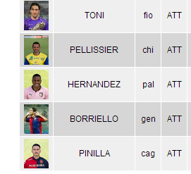Cerco di farvi giocare sereni,tutta la sfiga sugli infortuni,non vi preoccupate,cerco di attirarla sui miei giocatori soprattutto in attacco.Hernandez stagione finita,Borriello 2 mesi di stop,Pinilla e Pellissier hanno saltato le ultime due partite per infortunio,speriamo non si rompa anche Toni altrimenti gioco sicuro in 10.Certo che mai mi era capitata una cosa del genere,4 attaccanti su 5 fuori gioco,roba da pazzi.Evitare la retrocessione,in queste condizioni,e' davvero difficile.Spero per me che recuperi qualcuno!