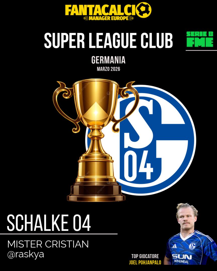 SerieB Super League Complimenti allo Schalke 04 di Cristian che con una prestazione top supera all'andata e al ritorno la corazzata Blackburn. Trofeo in bacheca e +70 euro.