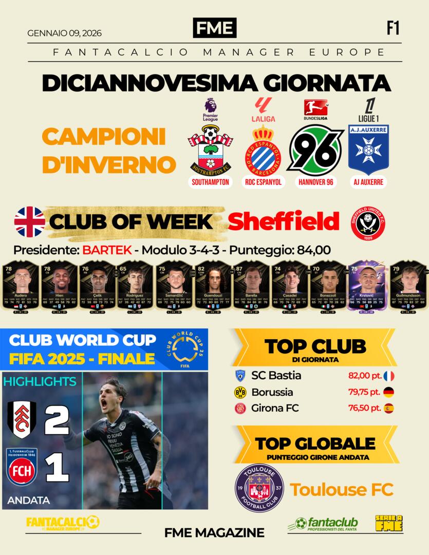 SerieA Risultati tornei. Club Team of the Week lo Sheffield di Bartek +5k 👏🏻. Top Club di giornata delle altre leghe +2k
