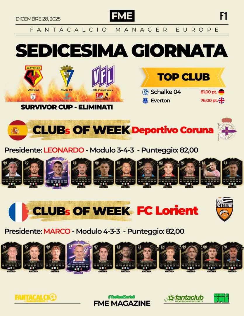 SerieB Risultati tornei. 2 Club Team of the Week +5k il Deportivo di Leonardo e il Lorient di Marco. Top Club di giornata delle altre leghe +2k