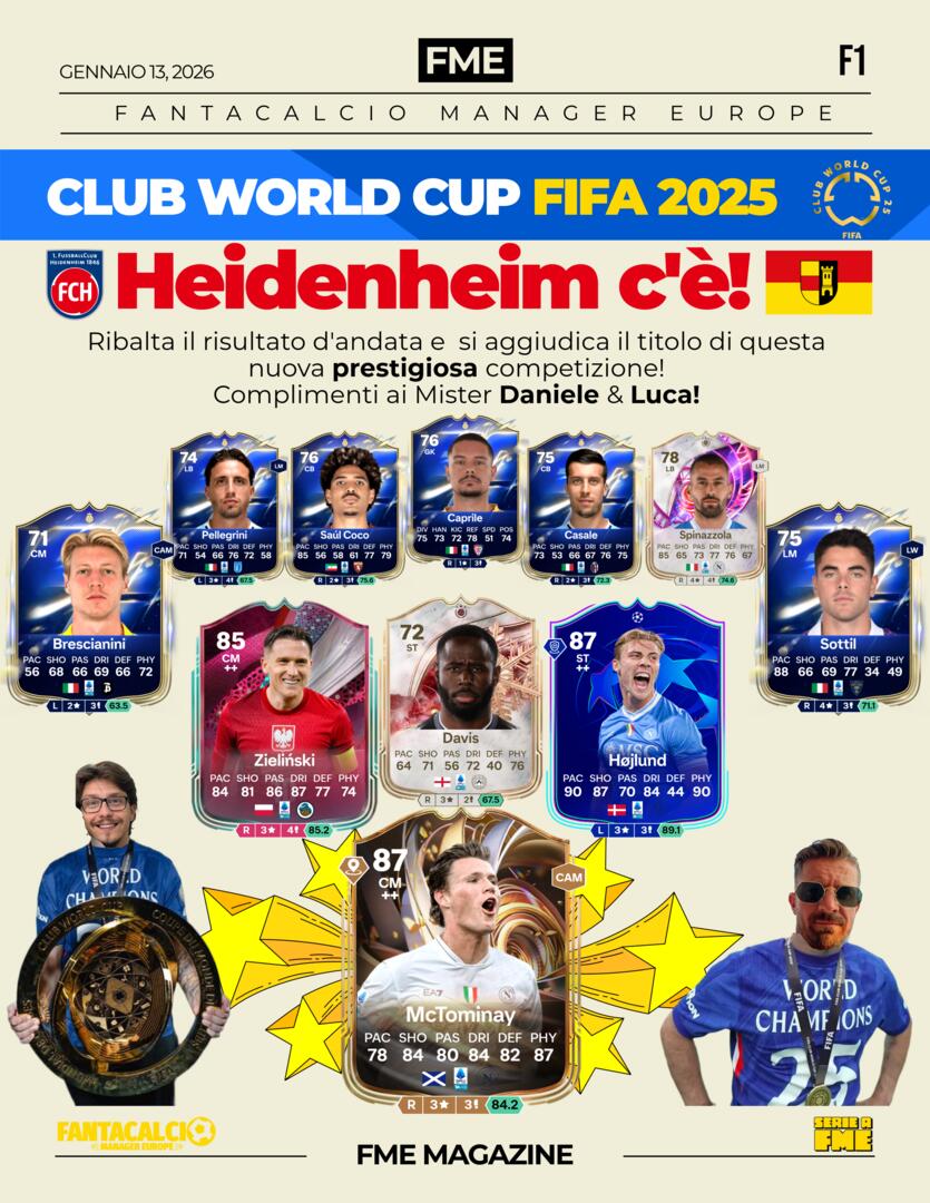SerieA Club World Cup Fifa 2025 dopo la Champions League, probabilmente, diventerà il trofeo più prestigioso di FME. Alla sua prima edizione il trofeo vola in Germania in casa Heidenheim. Complimenti a Mister Daniele e Mister Luca.👏🏻👏🏻👏🏻