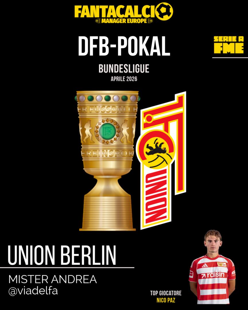 SerieA Eccolo il tanto atteso trofeo dall' Union Berlin di Andrea che porta a casa la DFB-POKAL ! Finale al cardiopalma, determinanti i nuovi acquisti GARCIA LOPES e BOWIE, Complimenti!! +45 euro