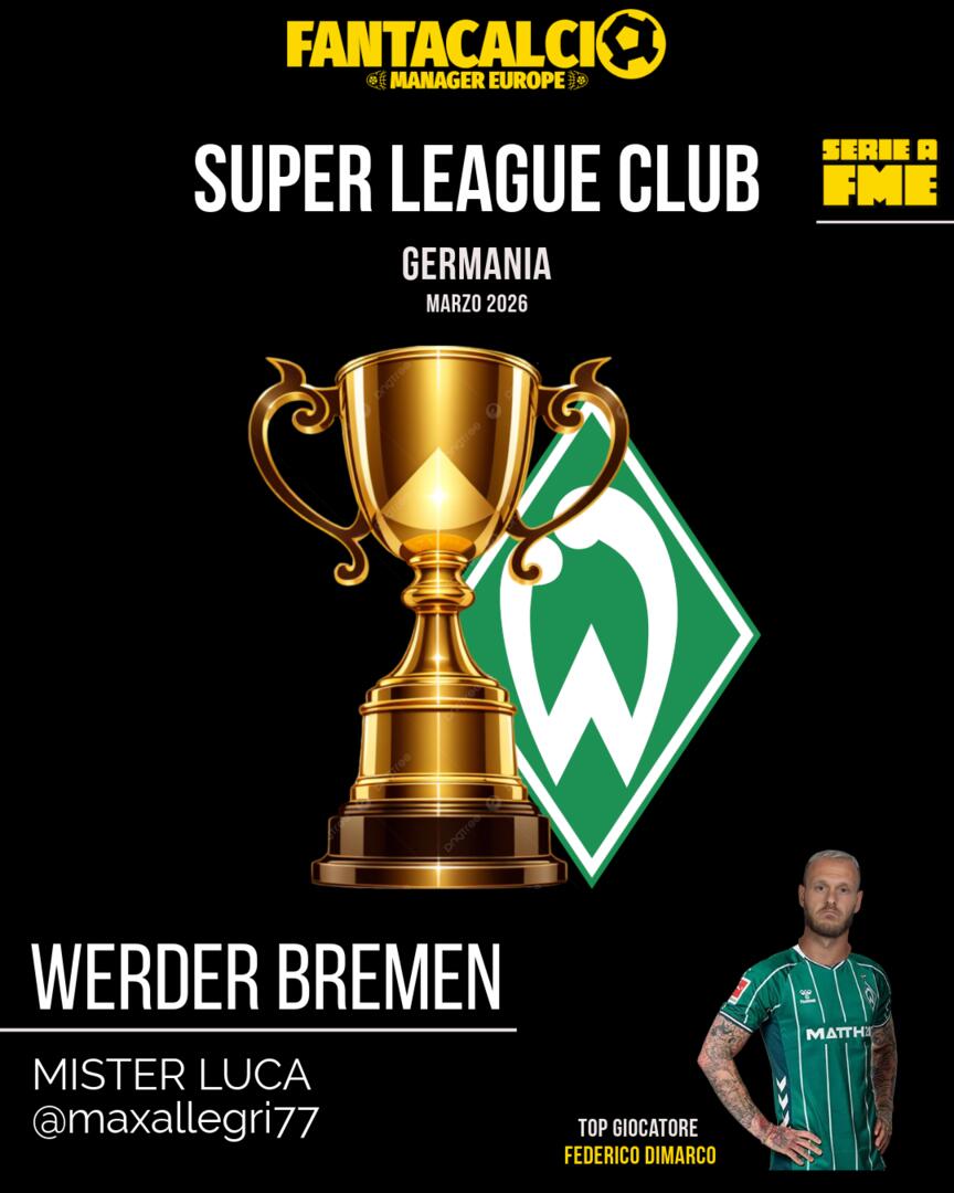 SerieA The Super League Club Il torneo più lungo di FME vola in Germania. Manco a dirlo, se lo aggiudica il Werder Bremen di Luca. Altro trofeo in bacheca + 90 euro. Complimenti Mister Luca 💪🏻