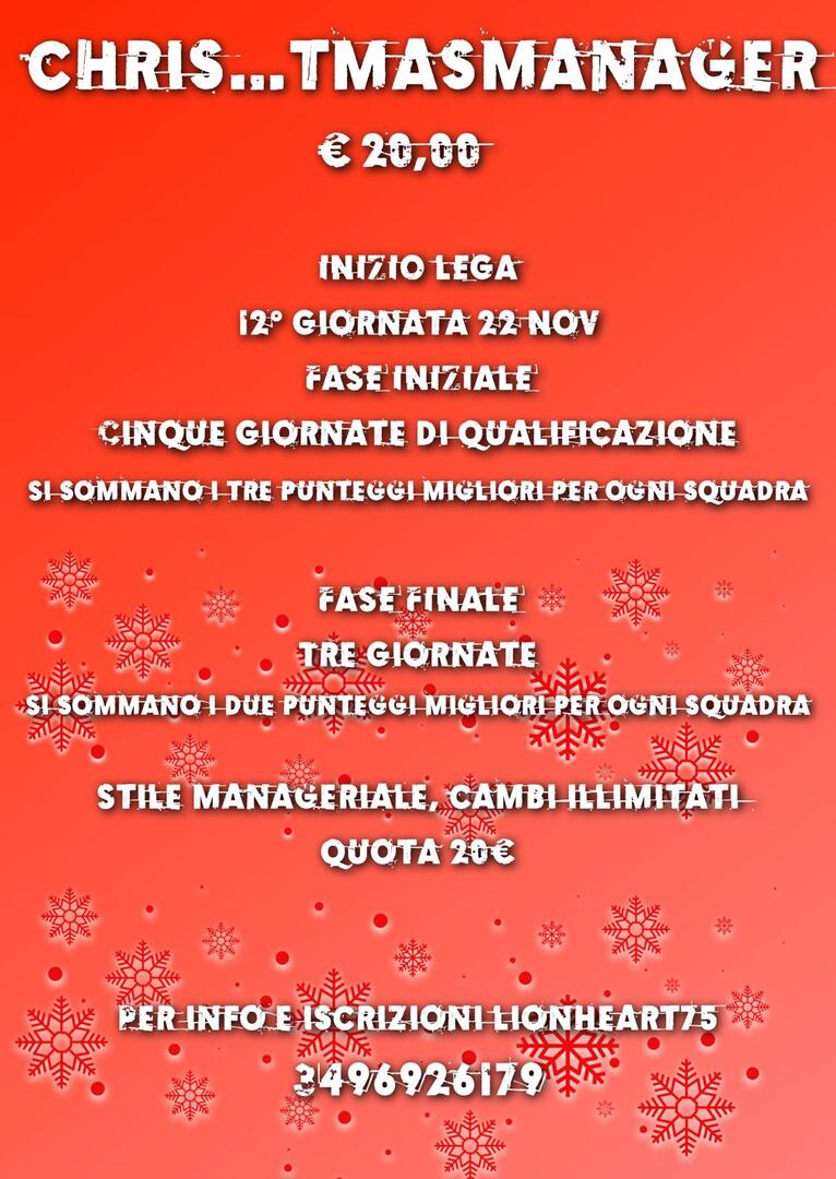 Terza edizione per la lega natalizia che nelle prime due ha raccolto oltre 40 partecipanti. Si gioca a somma punti, totale otto giornate, cinque per la prima fase(si terrà conto dei tre migliori punteggi per ogni squadra per stilare la classifica) e tre giornate per la fase finale (con la somma dei due migliori punteggi per ogni squadra). Cambi illimitati, no cambio modulo, no capitano, no fasce top player, no vincoli appartenenza.