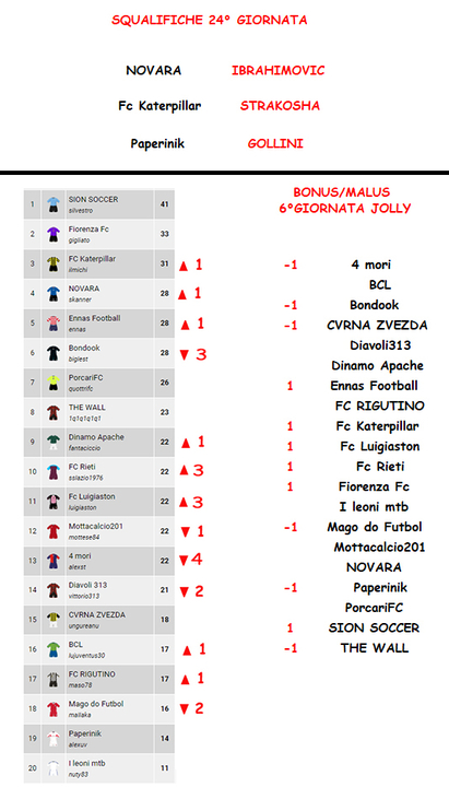 Sesta Giornata Jolly che lascia il segno in classifica. Bondook crolla contro l'armata di Sion e va in sesta posizione scendendo di tre posti. 4mori addirittura di quattro, andando da nona a tredicesimo. Bene le prime cinque, tutte vincenti; con Katerpillar, Novara e Ennas che salgono tutte di un posto.. Anche a metà classifica qualcosa si è mosso: Luigiaston e Rieti hanno guadagnato tre posizioni piazzandosi rispettivamente undicesimo e decimo. Si salva anche Dinamo che raggiunge il nono posto. Male Mottacalcio e Diavoli che scendono di 1 e 2 posti. Guadagnano una posizione pure Bcl e Rigutino, sedicesima e diciassettesima piazza per loro. Invariate le altre posizioni.