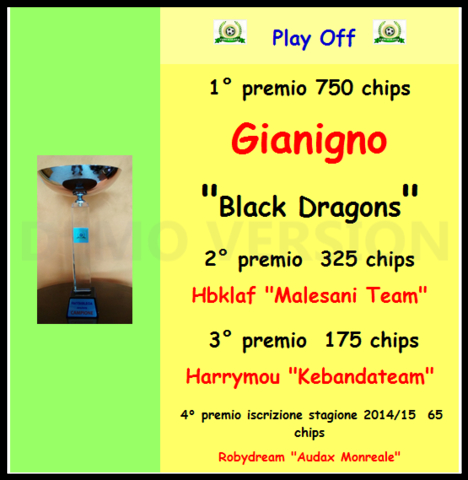 Finale e lega dall'esito non pronosticabile in alcun modo prima dell'inizio dei play off,questo sarebbe stato uno di quegli anteposto quotati a 200 che nessuno avrebbe mai giocato meno l'esaurito di turno.Black Dragons di Gianigno si impone in finale per 3-2 sul quotatissimo Malesani Team di Danilo di Fabio alias Hbklaf in una partita al cardiopalma che ha riservato emozioni fino allo scadere.In una lega in cui conta molto la posizione di accesso ai play off (i migliori del girone hanno punti di vantaggio negli scontri diretti) Gianigno si presentava ai nastri di partenza praticamente in deficit contro qualsiasi avversario dato che la sua posizione di classifica era un 9° posto di girone dovuto sia ad alcune scelte sbagliate in fase di girone appunto.....